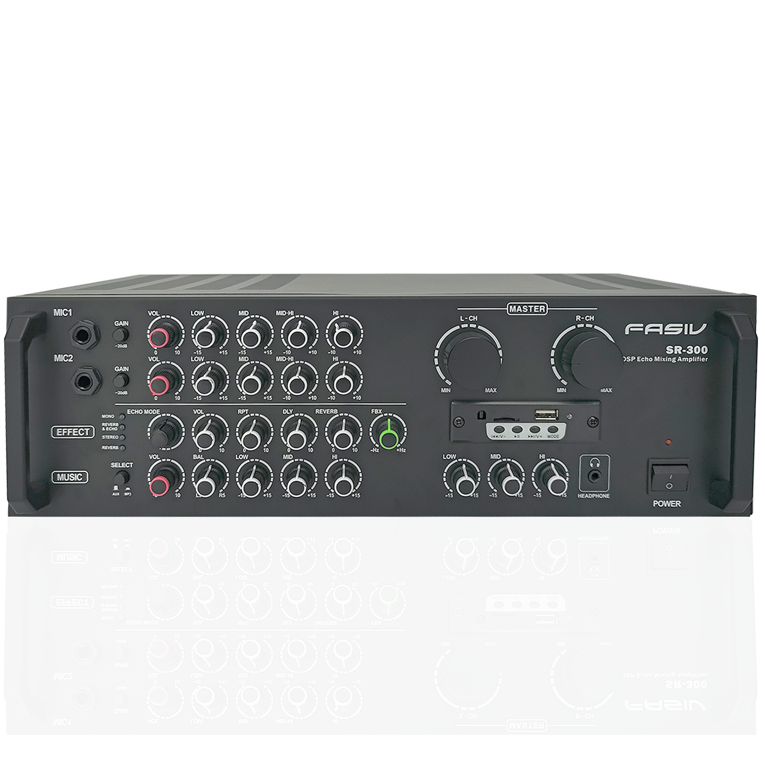 SR-300 karaoke amplifier with dual microphone configuration and gain function. Each microphone supports independent control of high, medium, and low frequencies, and is equipped with a potentiometer to adjust high and independent sound effects. Rich sound effects adjustment, including echo, repeat/loop, delay, reverberation and other special effects.